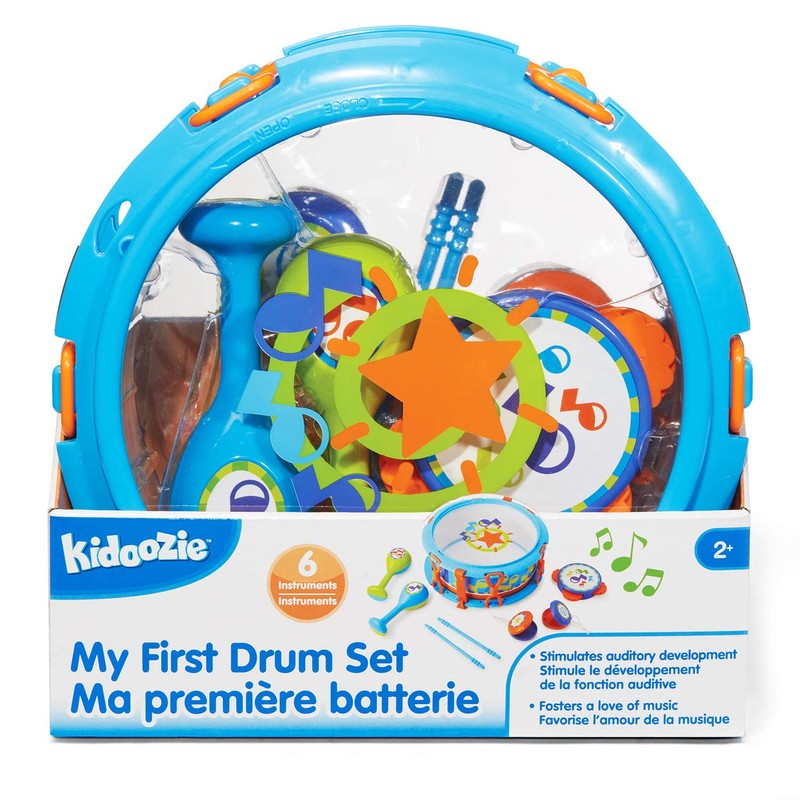 • PRODUCT SPECIFICATIONS: Package contains (1) Kidoozie My First Drum Set. Includes 6 instruments: drum, (2) drum sticks, (2) maracas, (2) casta nets, and tambourine. Recommended for children ages 2 years and older.