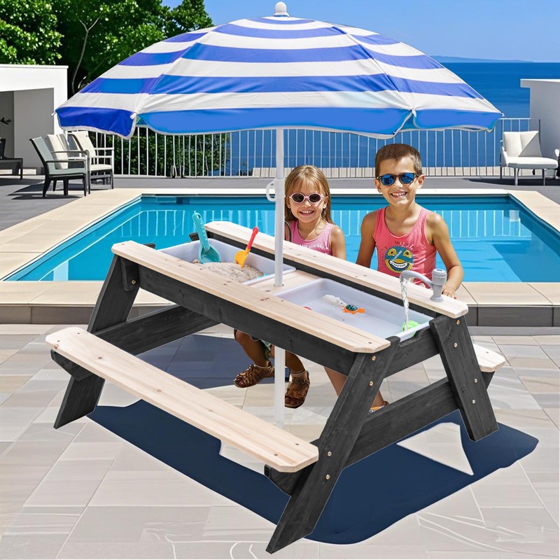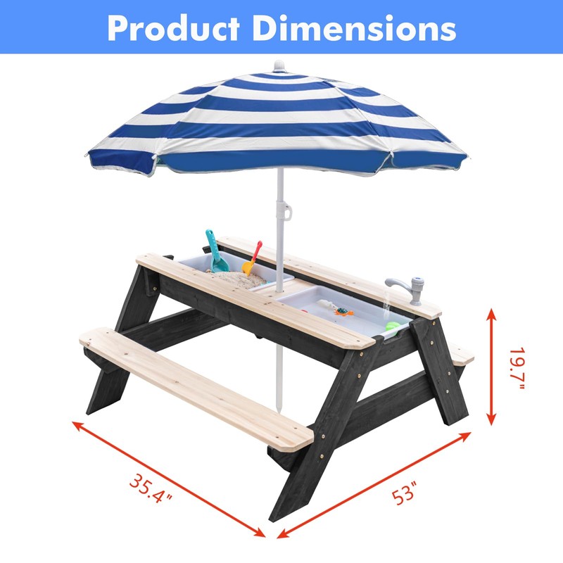 - Versatile 3-in-1 Design: Transform this picnic table into a sand or water play area by removing the top to uncover two durable plastic activity bins. Add the adjustable umbrella for extra shade and fun. With dimensions of 28" x 19.7" x 23.2" (L x W x H), there's plenty of room for creative play.