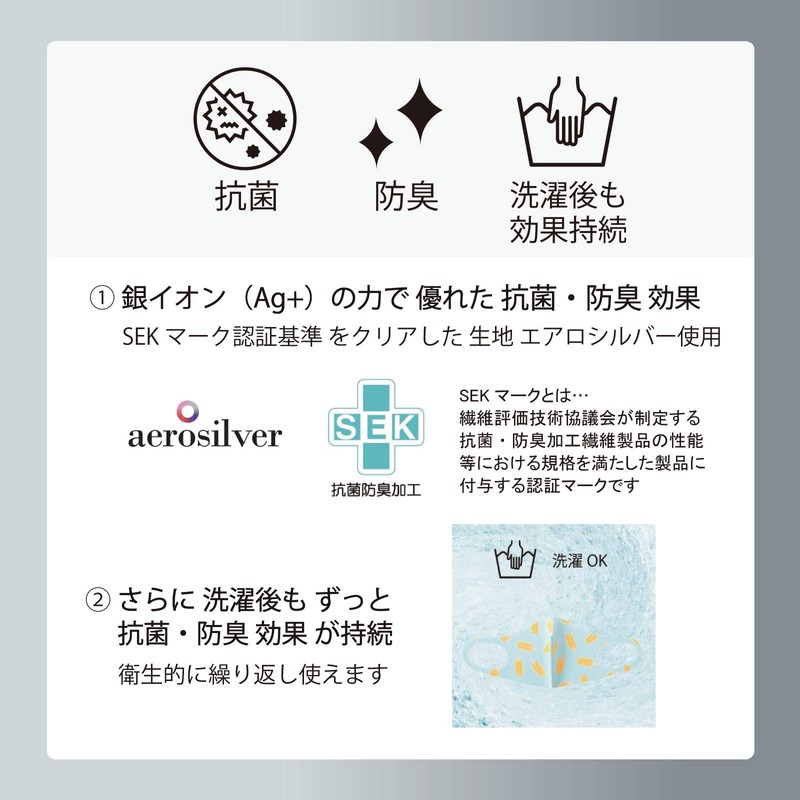 - Made with Aero Silver fabric that has passed SEK certification standards. (The SEK mark is a certification mark given to products that meet the standards for antibacterial and deodorizing processed textile products held by the Textile Evaluation Technology Council. )
