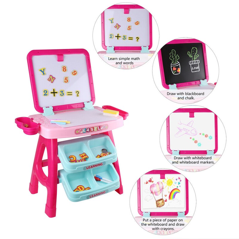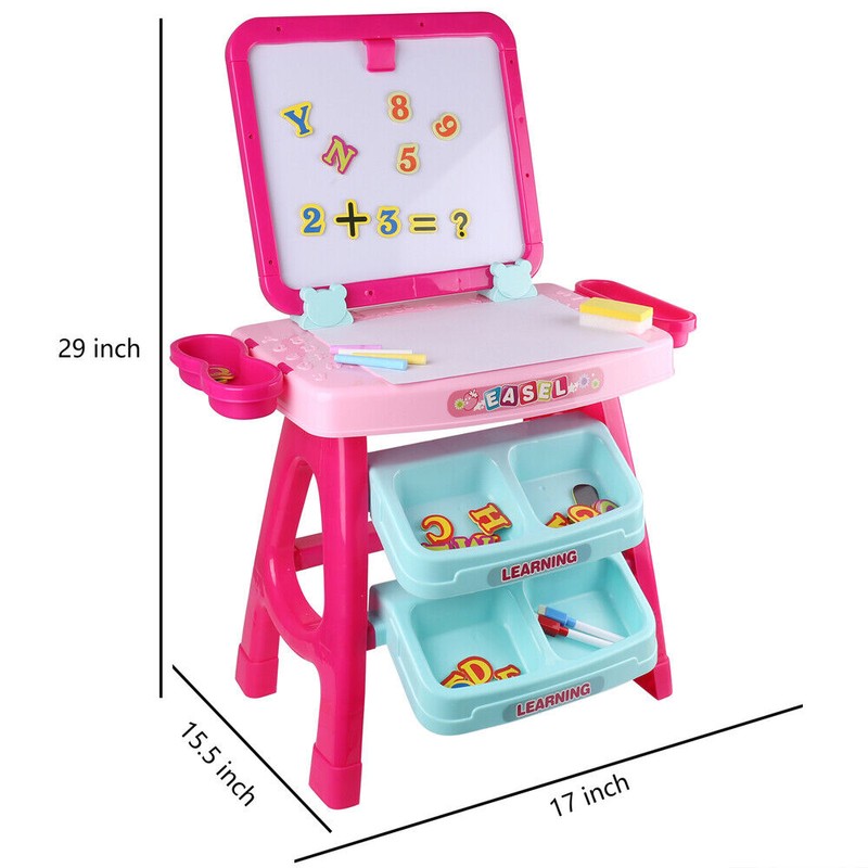 Description:This childrens' double sided easel has excellent durability, made of high quality plastic material, non-toxic, safe and environment-friendly, create more space for your child's imagination.Children's easel has double-sided,  One side is the chalkboard, which can be drawn, written and counted with chalk; the other side is a whiteboard with a whiteboard pen.Both sides of easel are magnetic, it can be used together with the paper for painting.Standing easel for painting, coloring, drawing, learning and more. Package includes dry-erase magnetic whiteboard chalkboard, dry erase pen and eraser, chalk, crayons.Encourage kids creativity. Allow hem to explore and develop their creativity.Kids double sided easel size: 29 x 15.5 x 17 inchesPackage Included:1 x Kids Easel