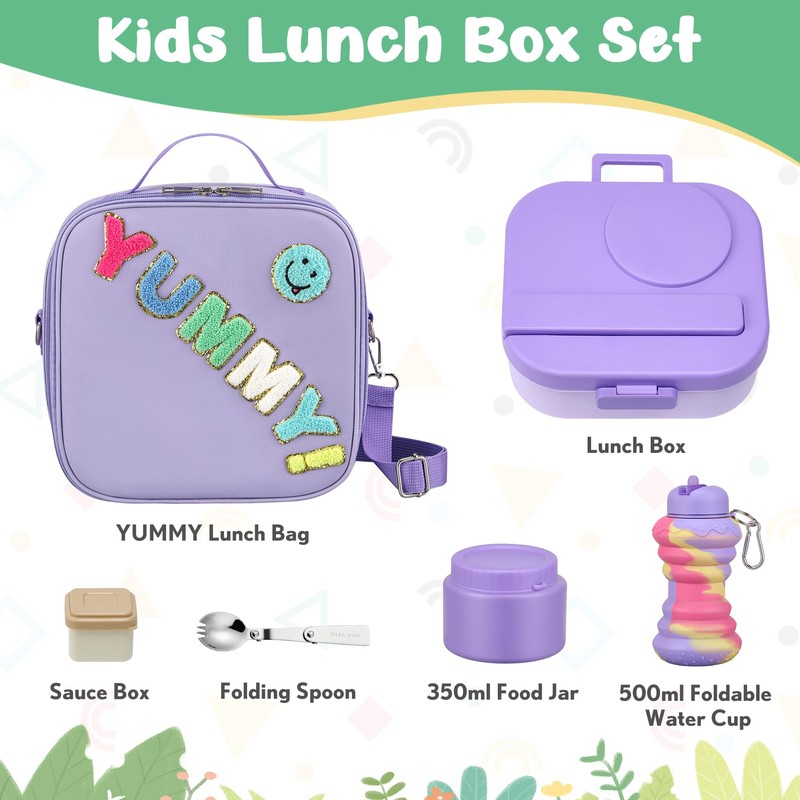 - Lunch Box Set: This kids lunch set comes with 1*insulated lunch bag, 1*lunch box, 1*8oz soup thermo, 1*foldable silicone cup, 1*sauce jar,1*food divider (4 or 5 compartment arrangements), 1*spoon.