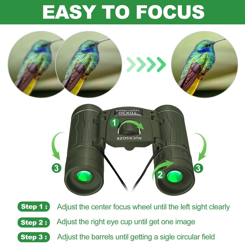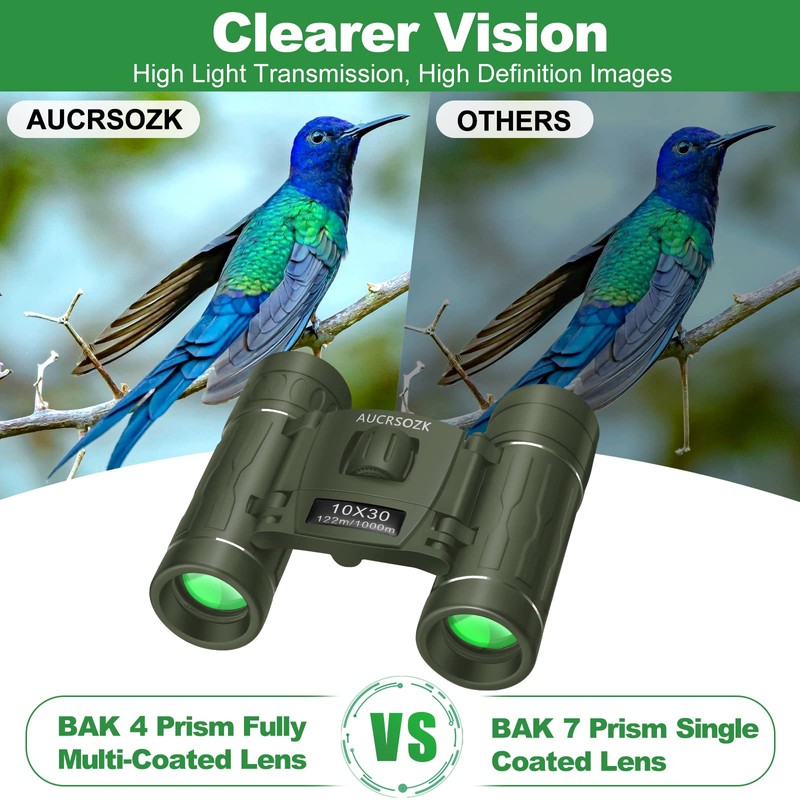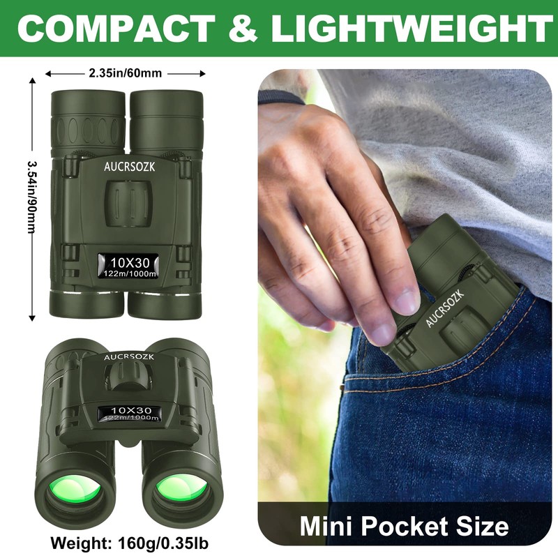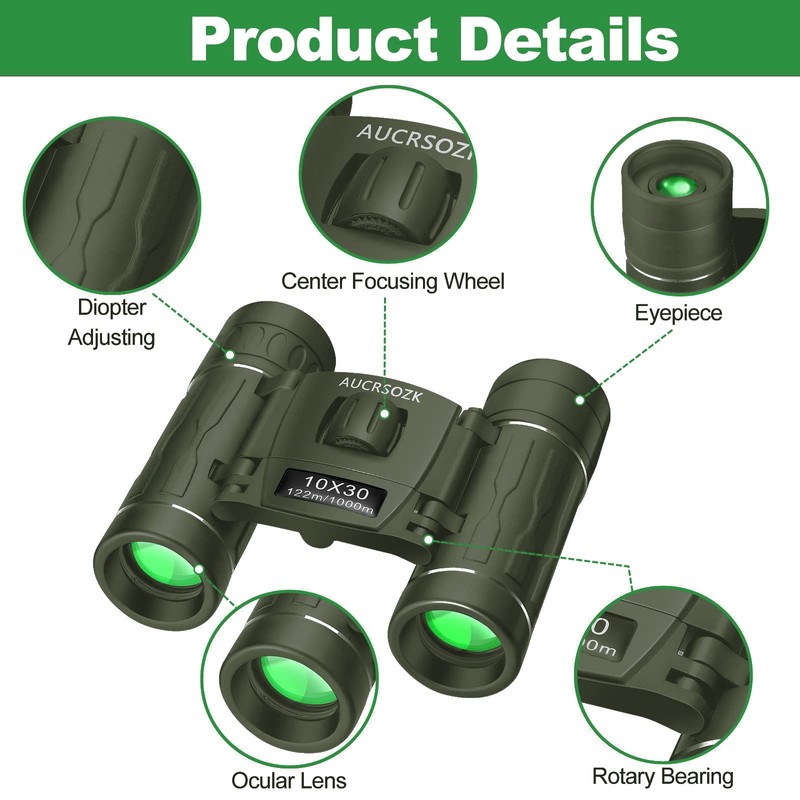 Kids Binoculars Compact for Bird Watching Hunting with Low Night Vision Aucrsozk 10 x 30 Small Mini Lightweight Folding Pocket Binocular Telescope Toy for Boys and Girls Outdoor - Green