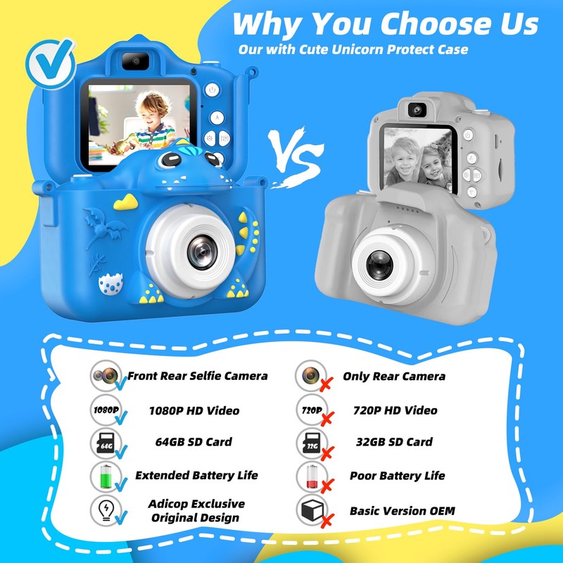 Kids Camera for Girls Boys Toddlers Childrens Age 3-8 Digital Selfie with 64GB Card for Son Daughter Grandson Granddaughter Christmas Birthday Gifts