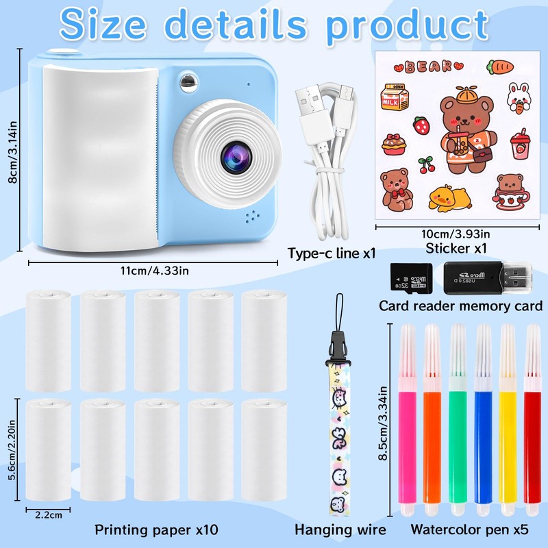 Kids Camera Instant Printing, - 2.4" HD 1080P - with 32GB SD card, 10 rolls of paper, pendant. Camera for kids and girls