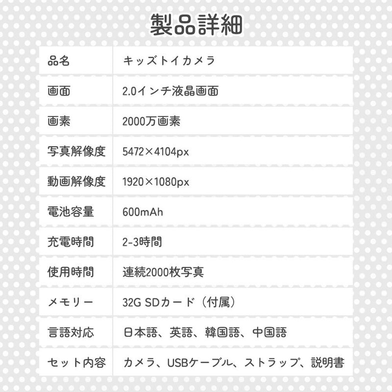 - ■Specifications Product Size: 9.5 x 6.5 x 5.2cm Screen Type: 2.0 inch IPS Color Screen Pixels: 20 Million Pixels Photo Resolution: 4608 x 3456 Video Resolution: 1920 x 1080 Optical Zoom: 3x Digital Zoom Memory: 32G SD Card (Included) Power Supply: USB Charging, Built-in Battery Material: Eco-friendly Silicone