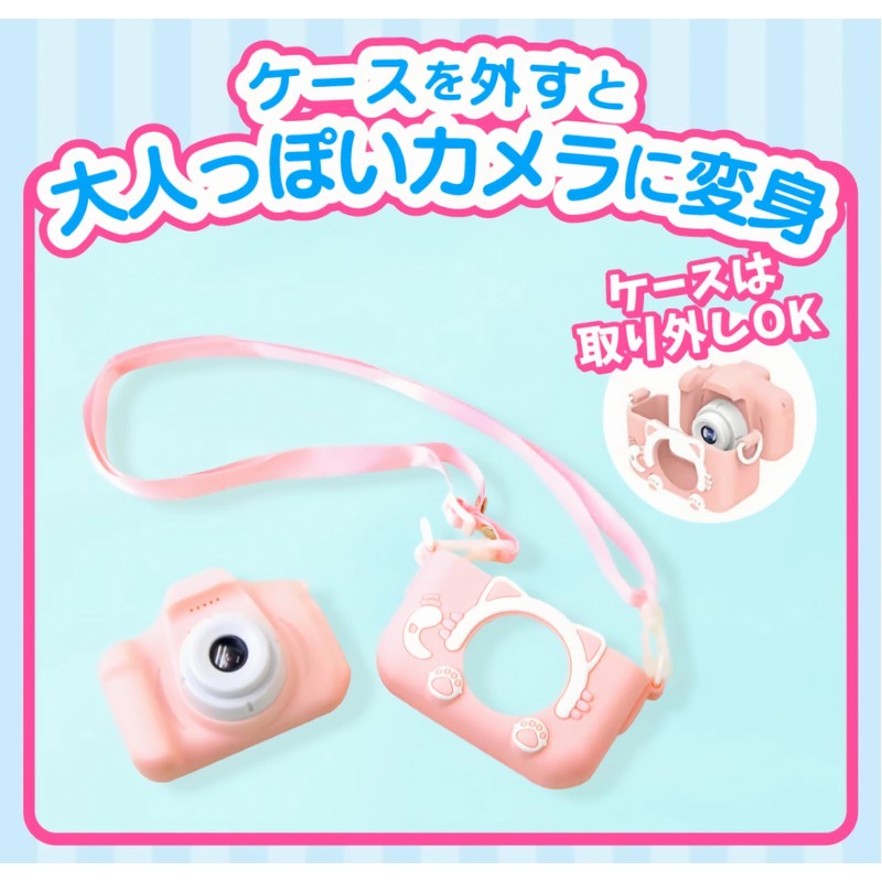 - (Removable Camera with Cover) Comes with a silicone camera cover for easy carrying. Protect your precious camera from scratches and impacts, so you can rest assured when you're on the go. The adjustable strap allows you to hang it around your neck so your child won't miss a photo opportunity