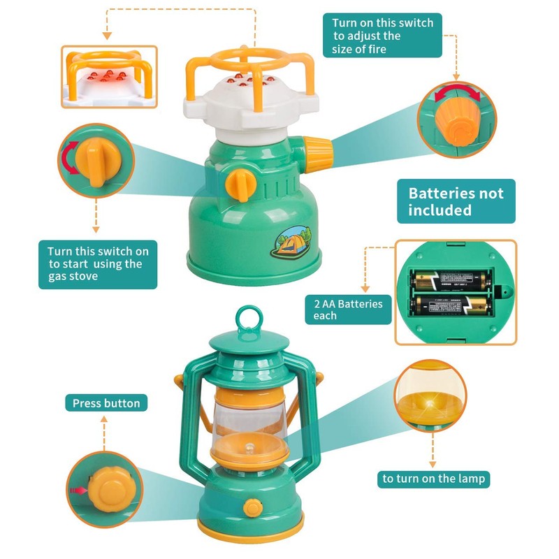 - KIDS CAMPING GEAR TOYS: With a press of a button, the illuminating gas stove and light up oil lantern create enchanting playtime scenarios, bringing the joy of camping to life!