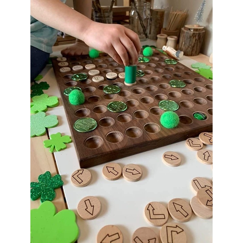 * Create a maze with various toys or loose parts as obstacles and have your child navigate a path through the maze with the directional discs. Take this activity a step further by taking turns giving and following directions (move two spaces forward, turn left, move three spaces forward, etc)