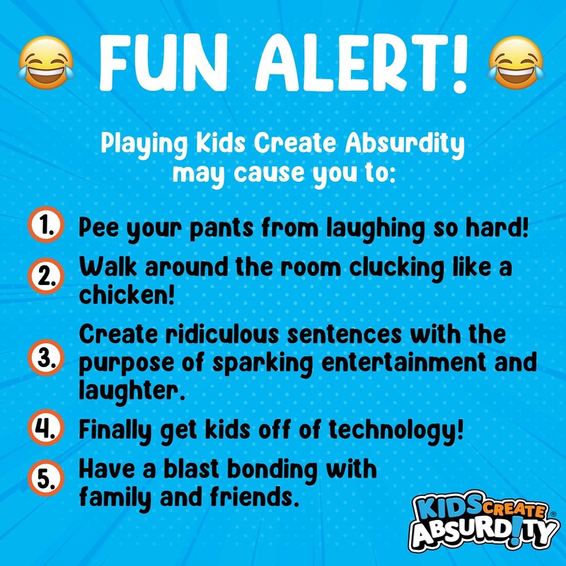 • LOTS OF LAUGHS-GUARANTEED-We guarantee that you will have so much fun and laughter playing Kids Create Absurdity, that if you do not like it just send it back for a full refund.