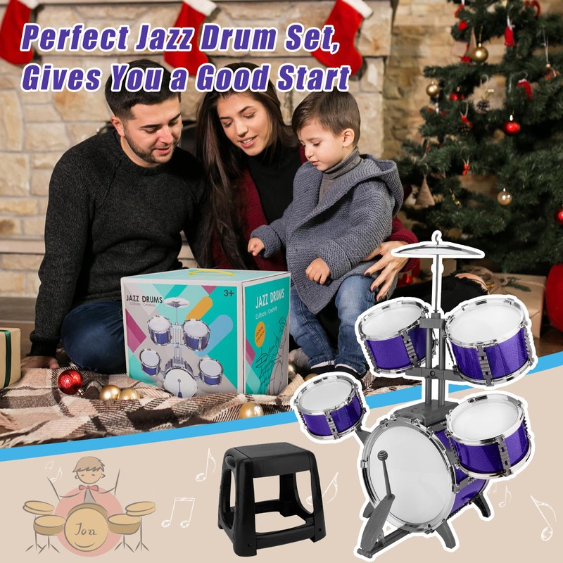 - 【Kids Drum Set with Stool】This jazz drum set is designed for children aged 3 4 5 6 7 years old. It is the perfect size for young drummers and comes with an upgraded comfortable playing stool, you can trust that your child is safe while having fun making music. The stool is sturdy and durable and can also be used as a daily use for children.