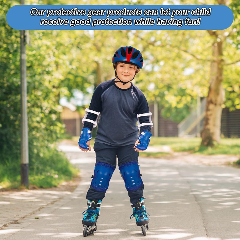 • 【7 pcs Kids Helmet and Pads Set 】The package includes 1pcs children's helmet, 2 pcs children's knee pads, 2 pcs elbow pads, and 2pcs wrist pads, providing your child with all-round protection during sports