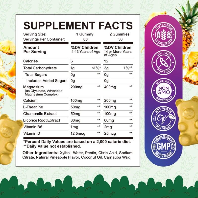 Kids Magnesium Gummies, Magnesium Glycinate Gummies for Kids & Adults with L-Theanine, Chamomile, Licorice, Vitamin D, B6 for Sleep, Relaxation, Brain & Muscle, Sugar Free Pineapple 60ct