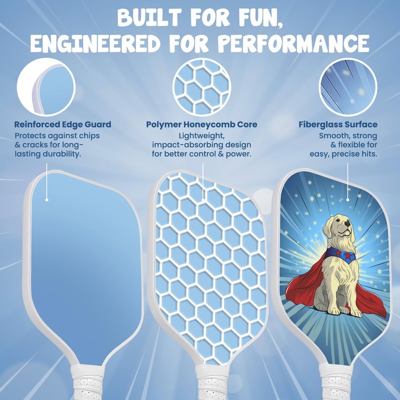 - PLAY LIKE A CHAMP WITH A ONE-OF-A-KIND DESIGN – This pickleball paddle for kids isn’t just another paddle—it’s a tribute to our beloved Golden Retriever, Dany! Featuring a copyrighted design that captures her playful spirit, this paddle makes every game exciting for young dog lovers and aspiring athletes. Mix and match! Choose from four unique designs and create your own kids pickleball set of 2 or 3 for even more fun.