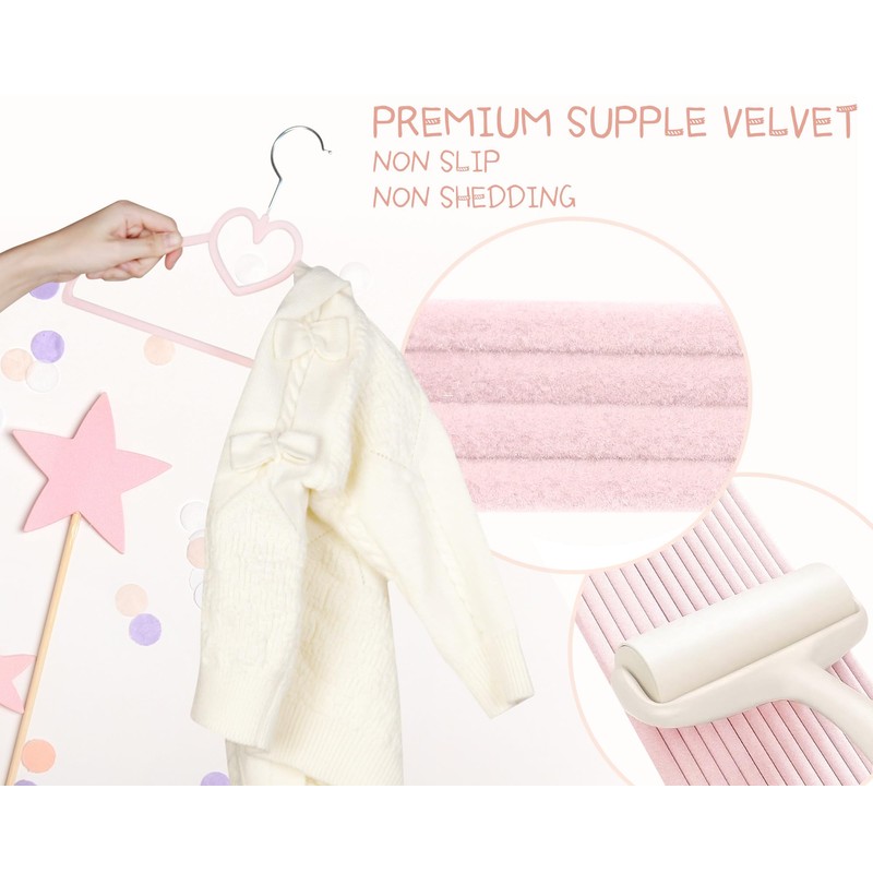 • Heart Kids Hanger Size: 7.5inch*13inch*0.18inch 50pcs Pink velvet hangers and 20pcs velvet pants clips. The clothes hangers with clips use high-quality ABS material with a load capacity of 10lbs, suitable for hanging clothes all year round
