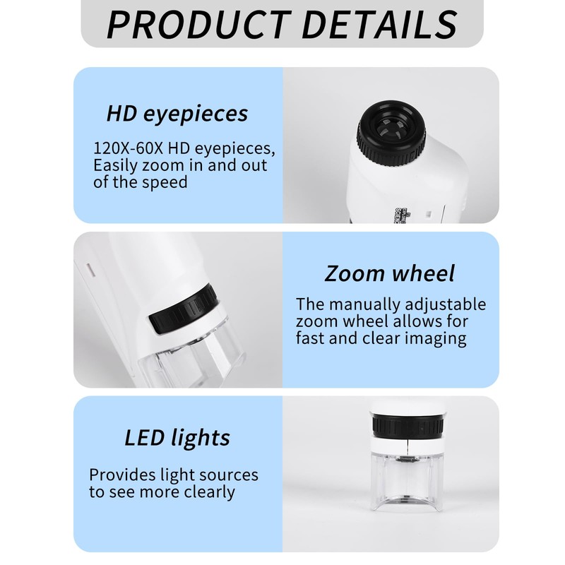 - ✨【Adjustable Magnification】- Magnify 60X-120X, focus quickly in 0.01 seconds, you can clearly see cells, microorganisms, plants, leaves, flowers, insects, etc.