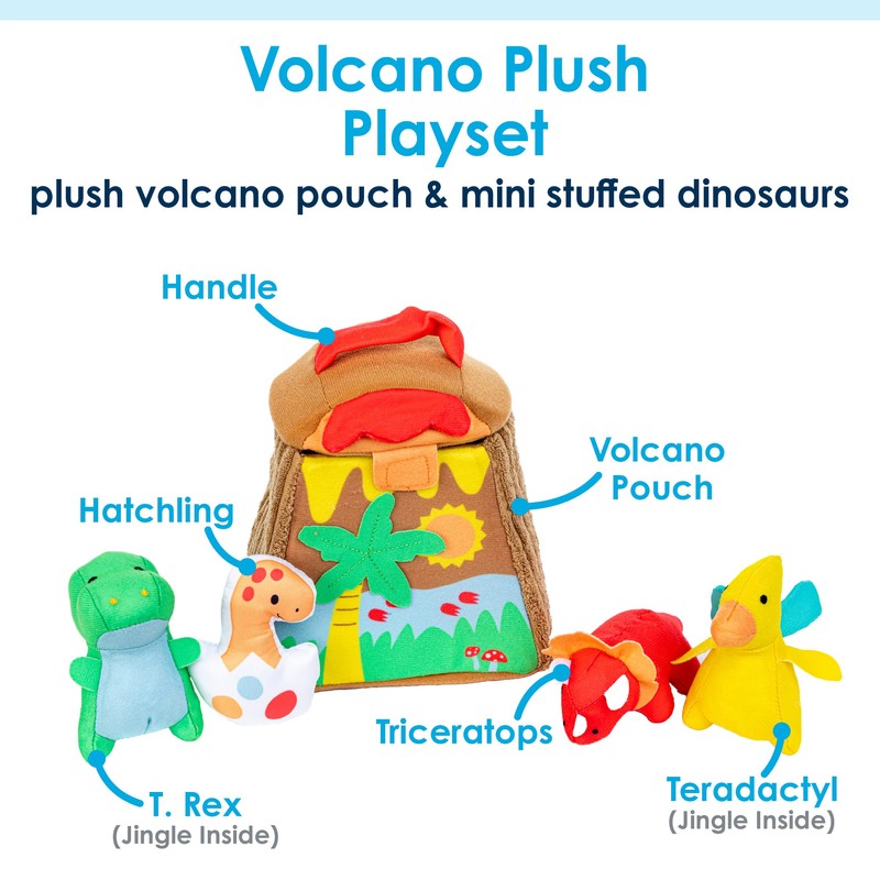 - SOFT DINOSAURS: Volcano playset includes on-the-go carry case with 4 small plush dinosaurs inside. Features T-Rex Jingle Bell, Triceratops Squeaker, Crinkle Pterodactyl and Crinkle Dinosaur in an Egg