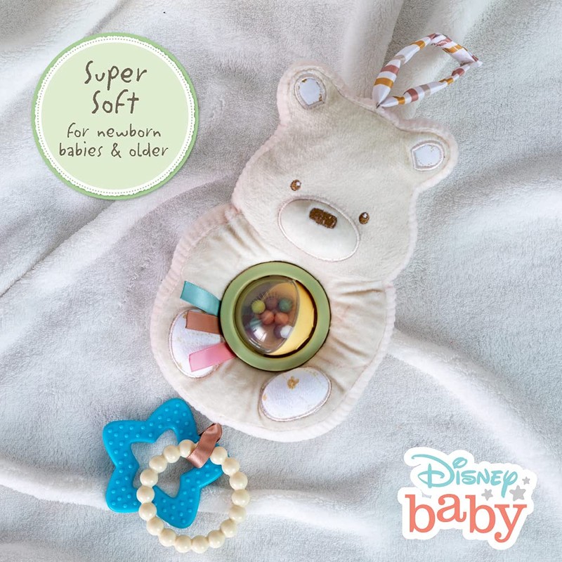 - CLASSIC POOH: Keep baby entertained, happy, & soothed with this adorable toy featuring soft texture, on-the-go velcro strap, spinner ball rattle, ribbons, teether rings, crinkle, & double-sided design.