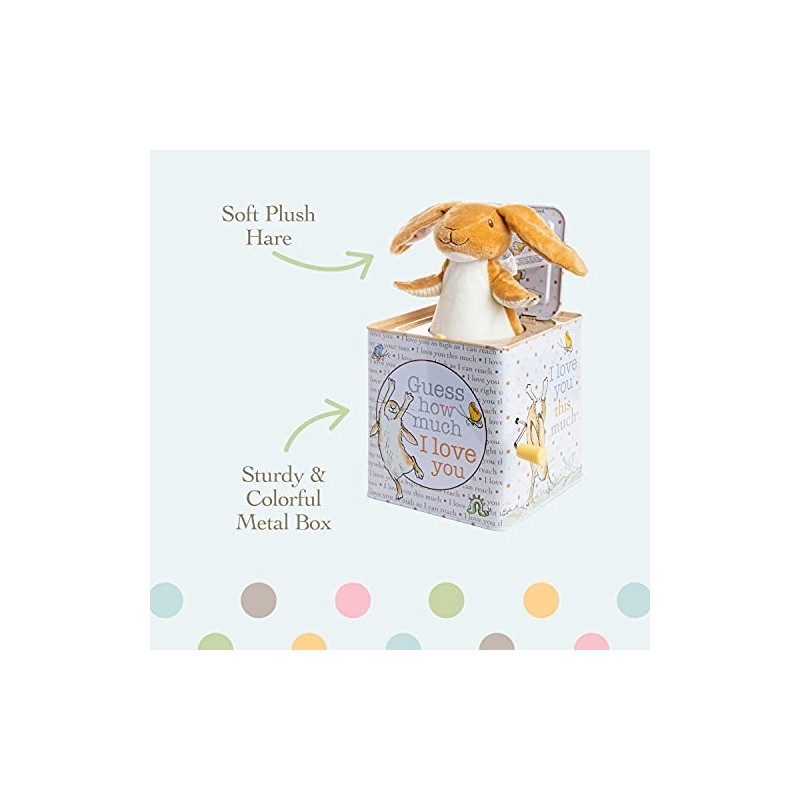 Inspired by the bestselling book Guess How Much I Love You. With over 19 million copies sold, in 34 languages, Nutbrown Hare from the international bestseller Guess How Much I Love. Hear Pop Goes the Weasel and wait for the surprise as little Nutbrown Hare pops up to say hello. The box measures 5.5" tall and can be displayed on the nursery shelf when baby is sleeping.