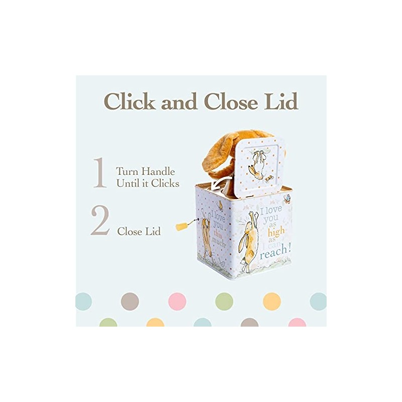 It's a pop-up surprise when a child holds onto the Guess How Much I Love You Nut-brown Hare Jack-in-the-Box. This classic toy features the adorable Nut-brown Hare with classic storybook graphics on all four sides. It plays the song "Pop Goes the Weasel" when the handle is cranked. The jack-in-the-box also has a pop-up Nut-brown Hare that springs into action near the end of the tune and surprises baby. This classic toy is sure to become a cherished part of any child's toy collection.