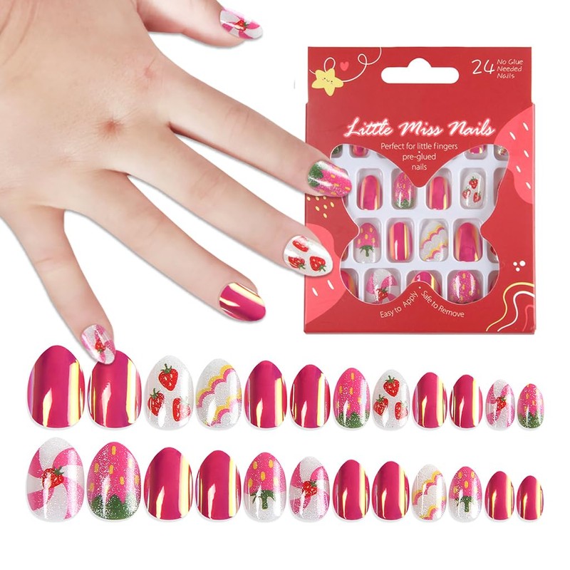 - Safe Material: The strawberry fake nails are made of safe material, non- toxic and tasteless, children can use it with confidence. it's lightweight and breathable, will not be burdensome after being applied to nails, specially design for children, durable and safe to nail and skin