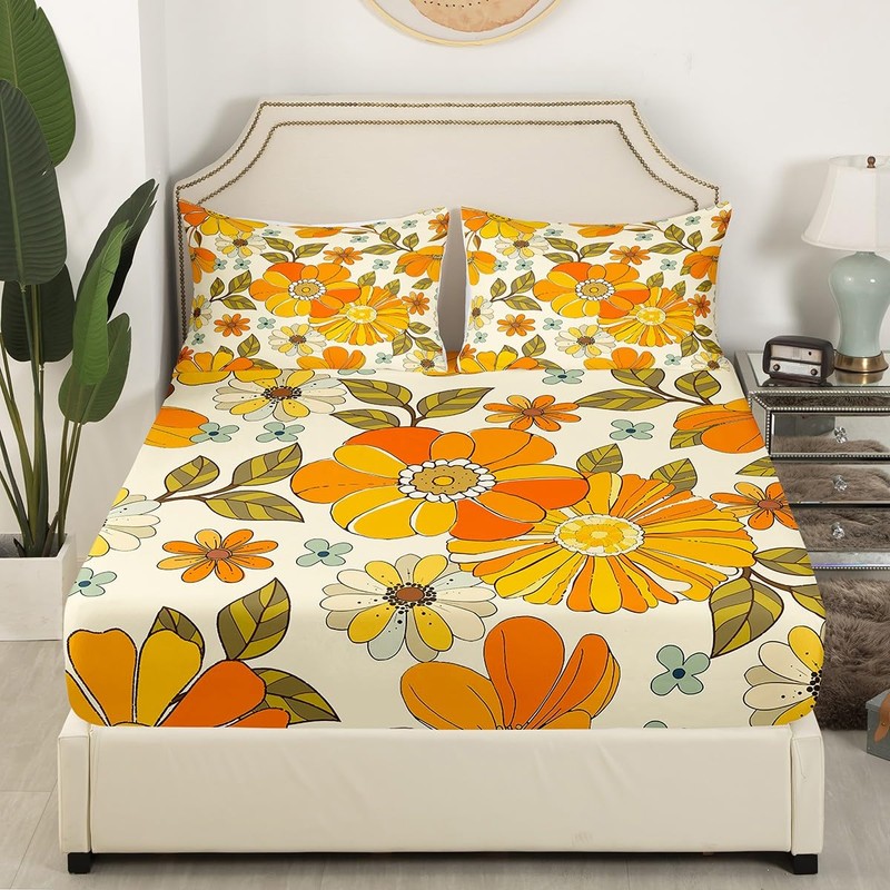 Kids Retro Flowers Full Fitted Sheet,Watercolor Yellow Floral Green Leaves Plant,Soft Polyester Bedding Set with Deep Pocket, 70s Trippy Daisy Bed Mattress Cover with 2 Pillowcases (No Top Sheet)