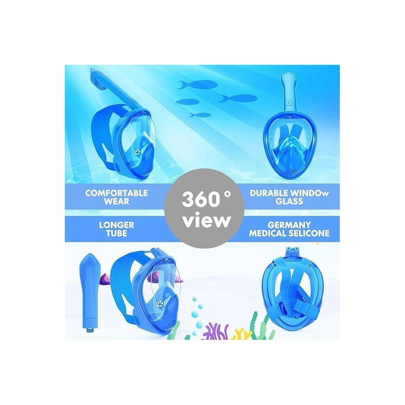 - Comfortable and Safe Fit: This Kids Snorkel Mask Full Face is made from durable PC with soft, thick silicone edges that ensure a secure and cozy seal. Anti-fog and anti-leak design makes it safe and easy for kids to enjoy underwater fun for hours.