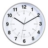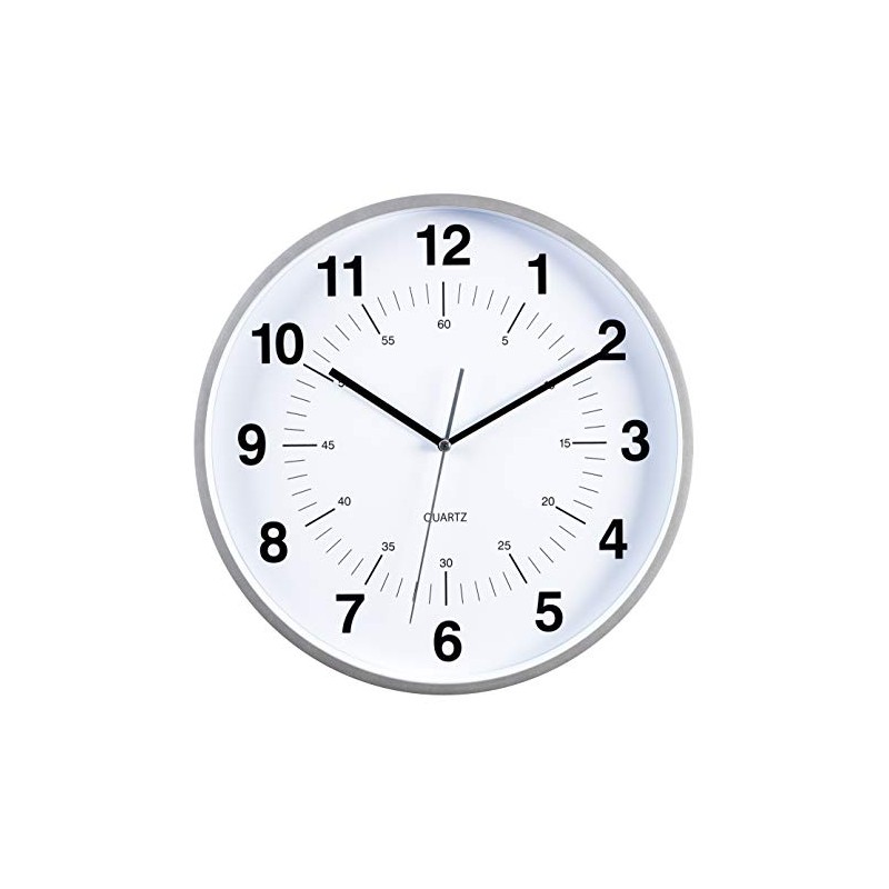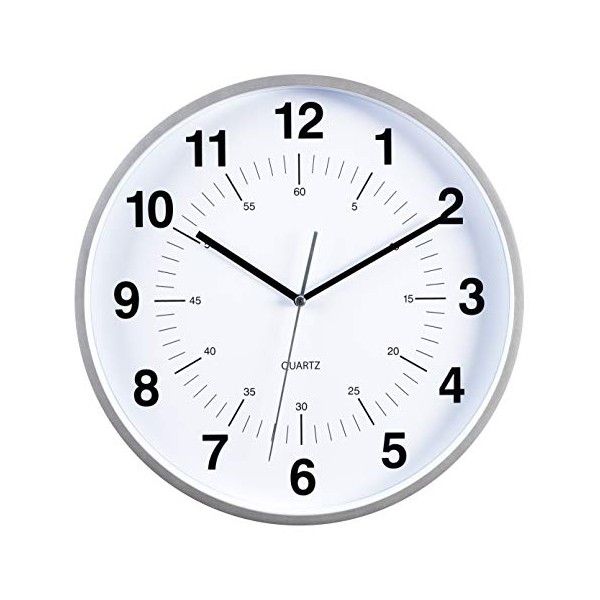 - Elegant non-ticking wall clock, 12" silver profile and 3/4" deep