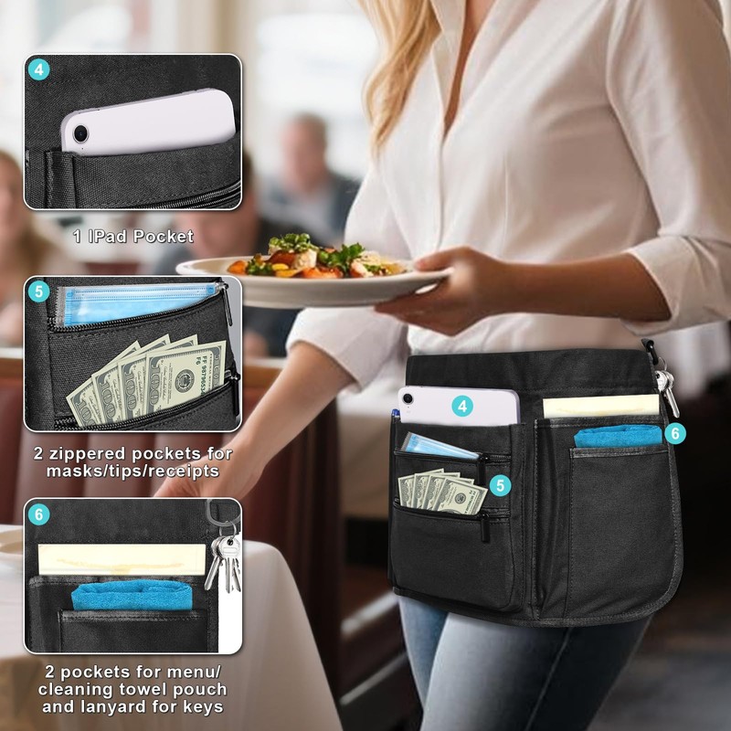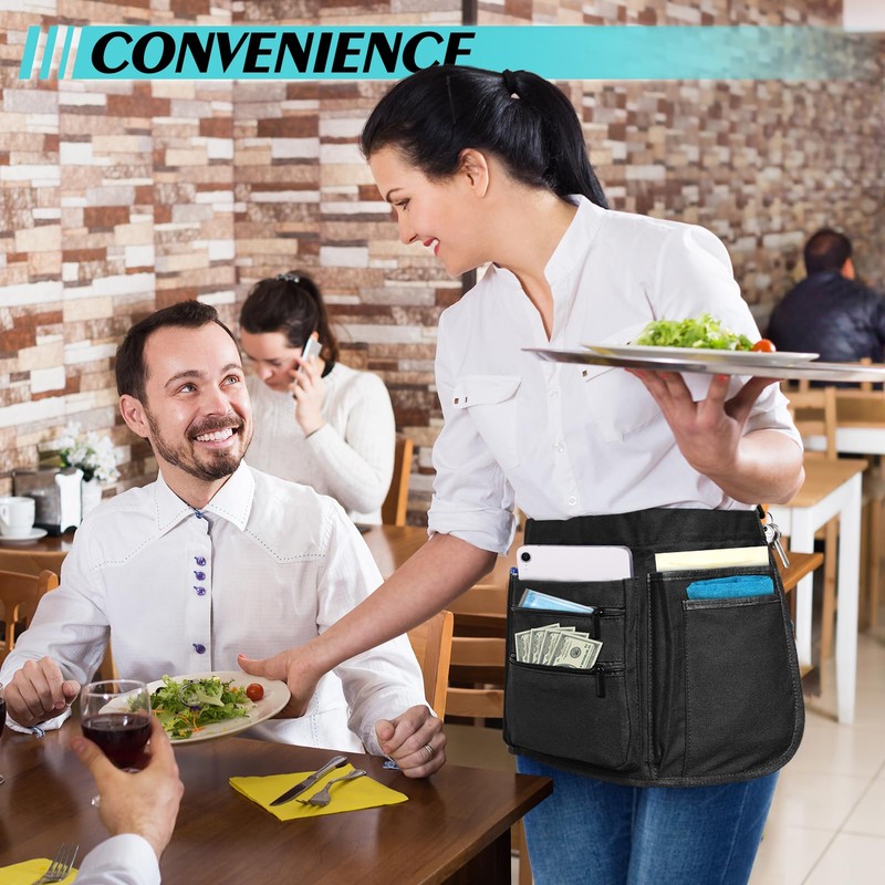 • VERSATILE DESIGN: Features multiple pockets perfect for carrying pens, notepads, order pads, and other serving essentials while maintaining a professional appearance
