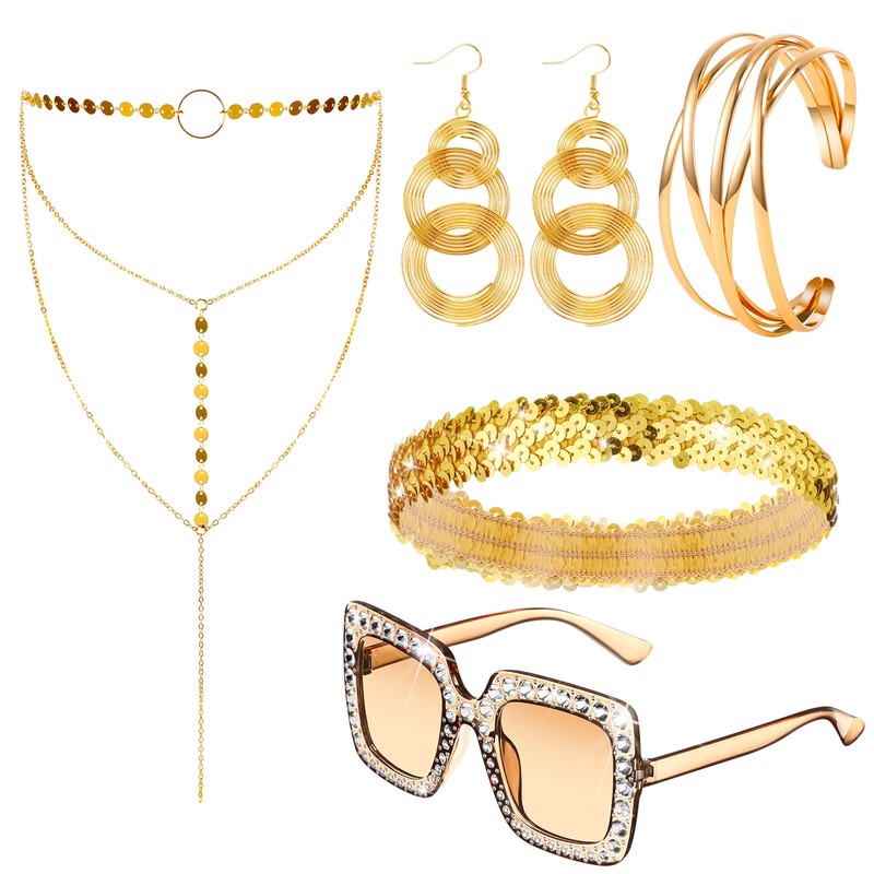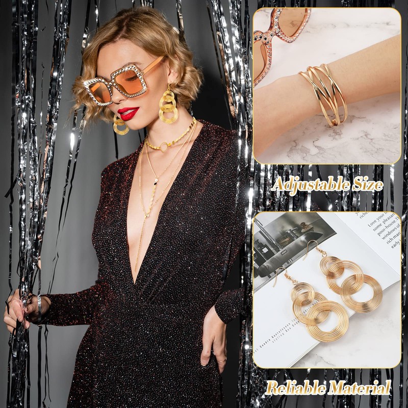 - Disco Costume Set: you will receive 1 set of 70s accessories, including 1 piece of layered choker necklace, 1 piece of elastic sequin headband, 1 piece of multilayer cross wire bangle bracelet, 1 piece of rectangle disco sunglasses and 1 pair of triple swirls disco earrings; The set can provide a nice matching choice to your 60s 70s party costume