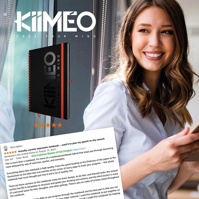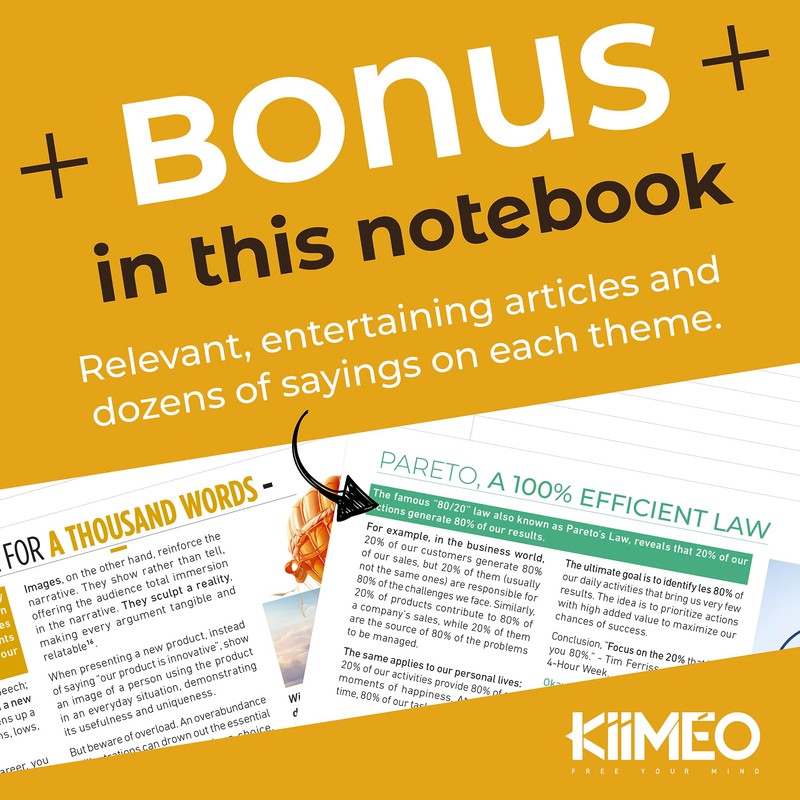 - OPT FOR AN INNOVATIVE NOTEBOOK: Be prepared to be amazed! With its resolutely new, high-quality design, KiiMéo won't go unnoticed. Whether at professional meetings or informal gatherings, leave a lasting impression by taking out your KiiMéo notebook. Thanks to its unique features, KiiMéo lets you organize your ideas, plan your goals and turn them into action on an undated medium.