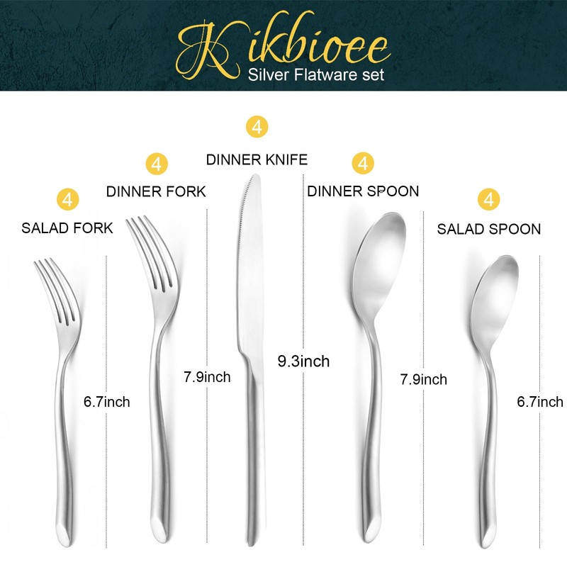 - 【20-PIECE SILVERWARE FOR 4】:20pcs stainless steel silverware set comes with 4 dinner forks, 4 dinner spoons, 4 dinner knives, 4 teaspoons and 4 salad forks.