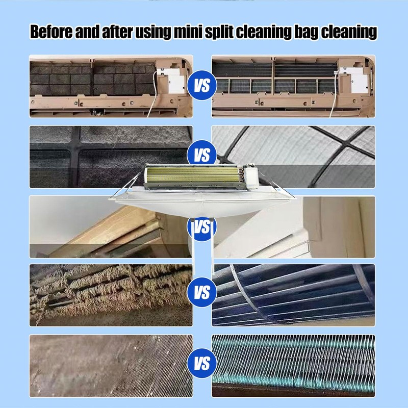 - 1. Reusable Mini Split Cleaning Bag with Dual Drain Tech foldable Mini Split Cleaning Bag built for durability.Crafted from industrial-grade double-layer Oxford cloth, it’s designed to outlast flimsy disposable bags. Our patented Dual Drain system features oversized hoses for 2x faster water flow—no clogs, no spills. Collapses flat for storage, fits tight spaces, and works for endless uses.Say goodbye to messy leaks and hello to pro-grade maintenance