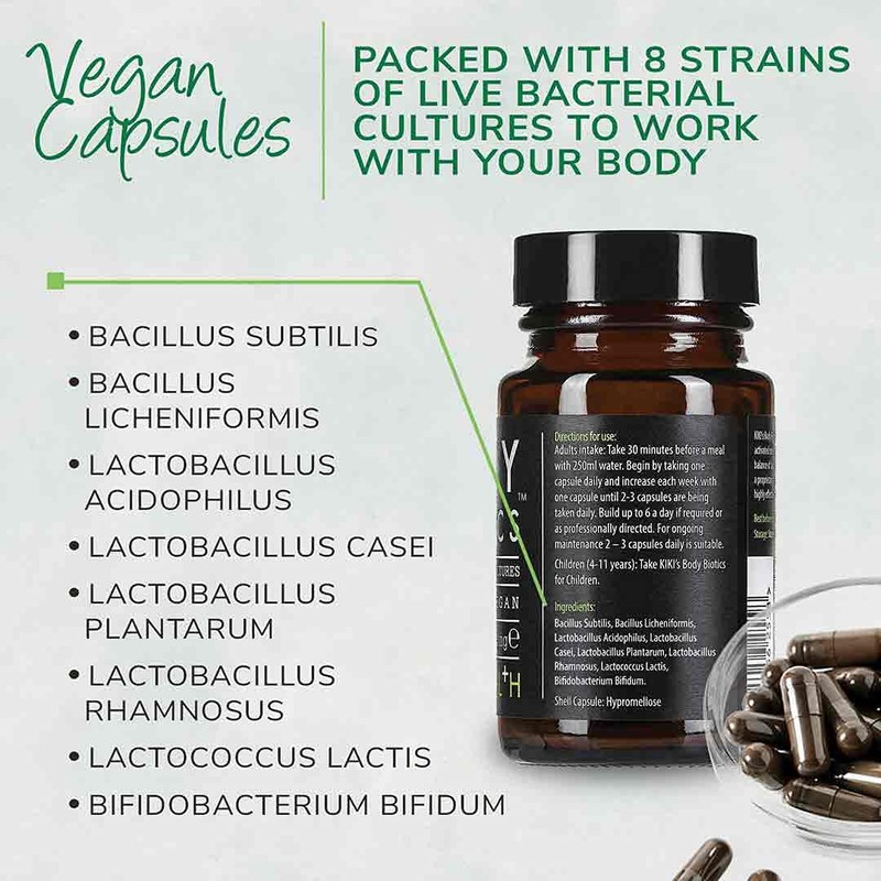 - SOIL BASED ORGANISMS - Body Biotics capsules contain a symbiotic combination of 8 highly effective friendly bacteria super-strains; Bacillus Subtilis, Bacillus licheniformis, Lactobacillus Acidophilus, Lactobacillus Casei, Lactobacillus Plantarum, Lactobacillus Rhamnosus, Lactococcus Lactis, Bifidobacterium Bifidum; Shell capsule: Hypromellose