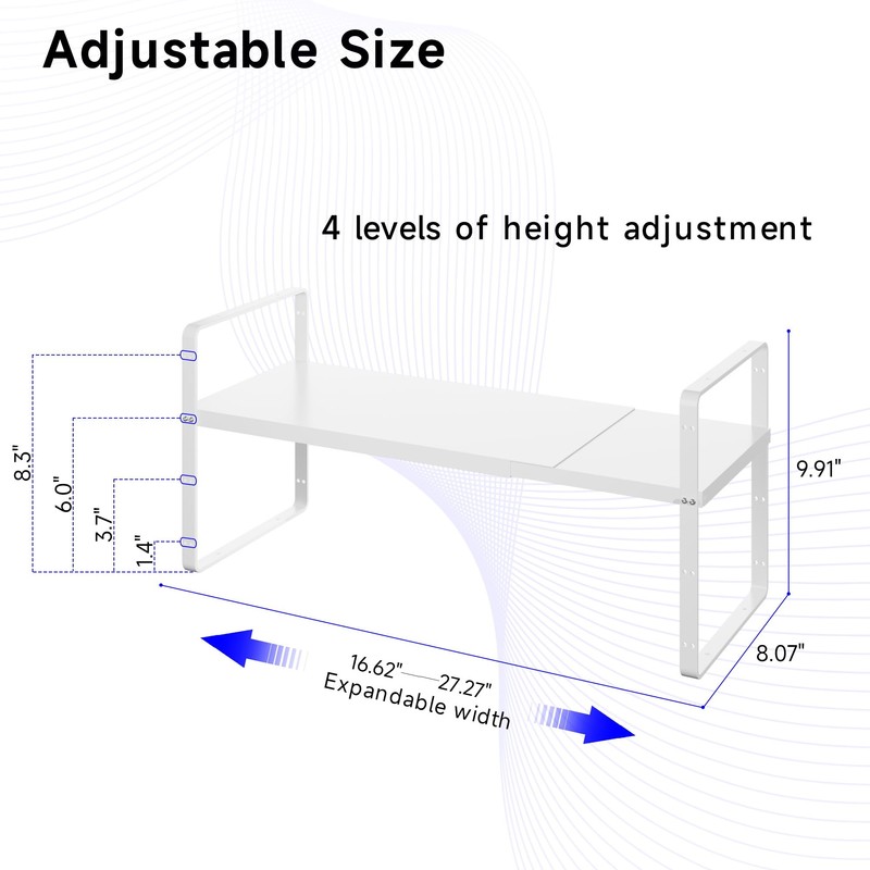 - 【Flexible & Stackable】 This cabinet shelf is expandable and stackable, allowing you to adjust the width and height to suit your needs. The width can be extended from 16.62 inches to 27.27 inches, and multiple shelves can be stacked together to create multiple levels of storage space.