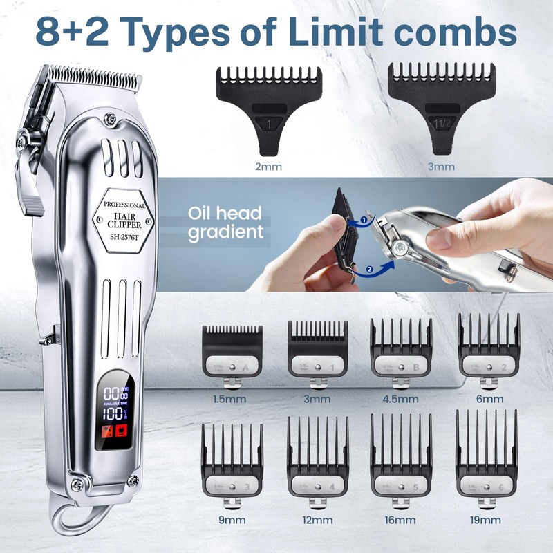 - LED Display and Ergonomic Handle: The built-in digital display allows you to quickly check power reminders, lubrication reminders, and charging status. The hair trimmer contains a high-capacity lithium-ion battery (2500 mAh), providing 5 hours of usage after 180 minutes of charging. These professional hair clippers are comfortable to hold, convenient to use, and easy to clean