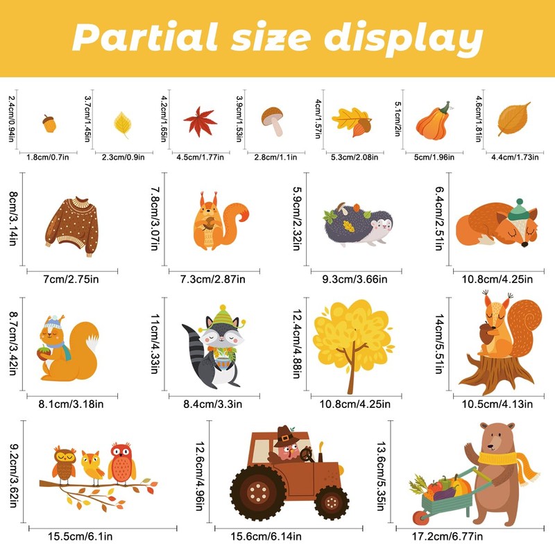 - 🍃【Full of Fall Thanksgiving elements】The Fall Thanksgiving party window stickers contain many Thanksgiving harvest elements, such as maple leaves, squirrels, hedgehogs, brown bears, turkeys, which will add fun to the autumn Thanksgiving party, making the scene full of vitality and festive atmosphere.