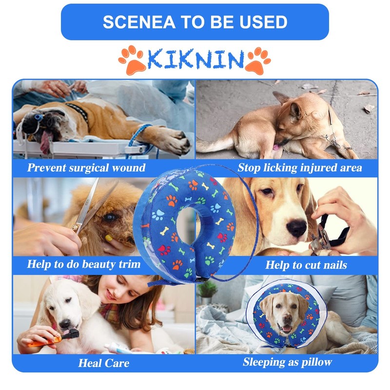 KIKNIN Dog Cone, Inflatable Dog Collar for Small, Medium and Large Dogs, Soft Recovery Pet Cone After Surgery with Adjustable Buckle and Cute Pattern to Stop Licking and Biting Wounds (Blue, Large)
