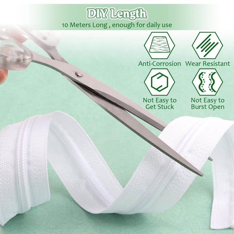 - Value package: you will receive a 10 metre long white endless zip and 20 white metal zip heads. The width of the zip is approx. 3 cm and the width of the zip teeth is approx. 6 mm. The length can be easily cut, enough for your different hand sewing needs.