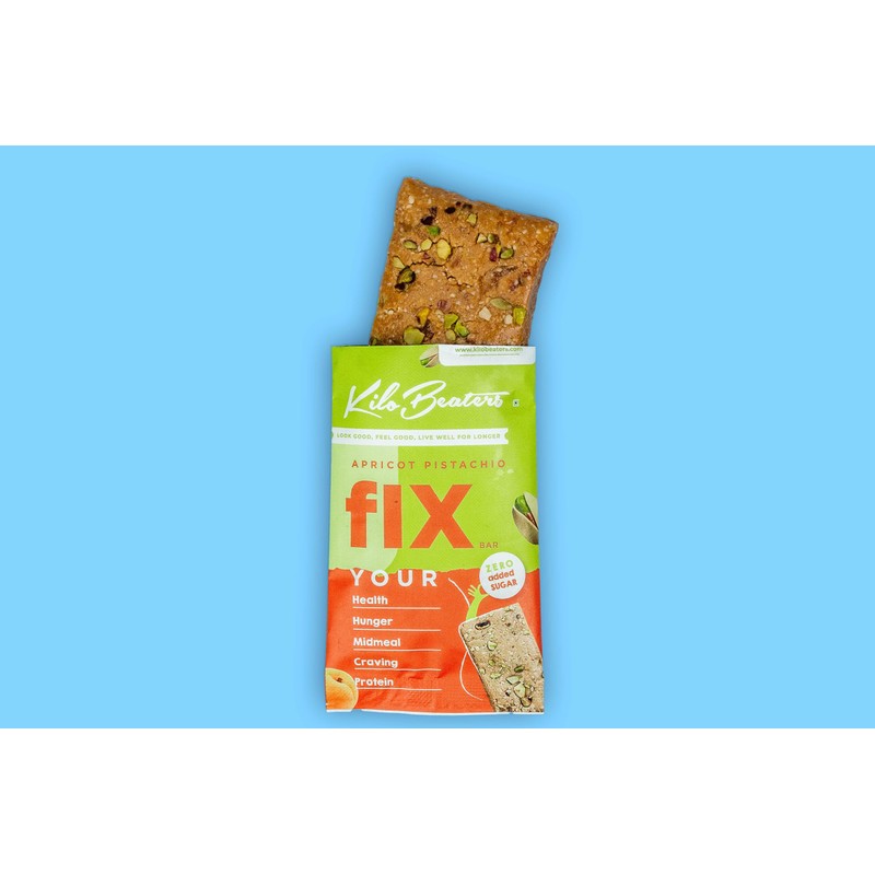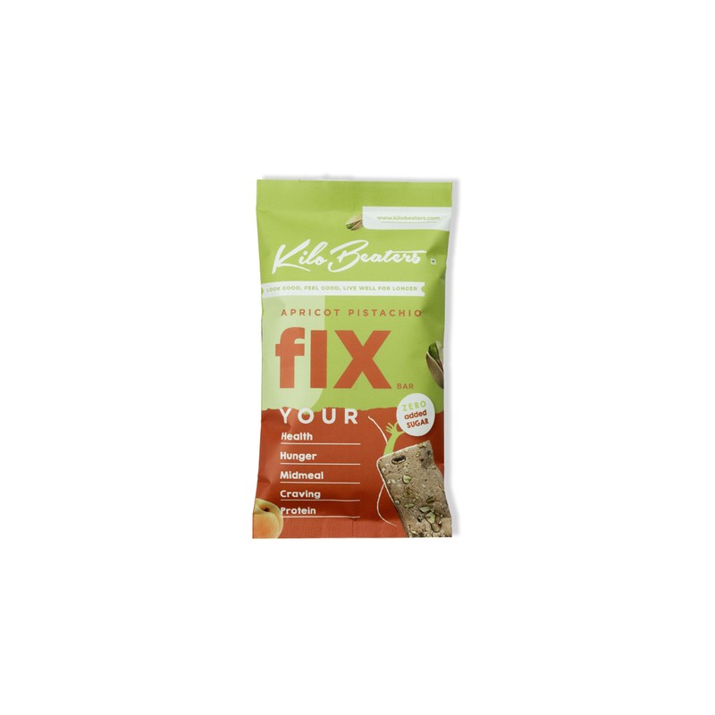 - Ingredients: The Apricot Pistachio Protein Fix Bar from KILOBEATERS features cashew nuts, peanuts, whole apricot, pistachios, and dates for sweetness, along with good fats from nuts and seeds. It contains whey protein concentrate (22%), cashew nuts (21%), peanuts (20.6%), dates (15.4%), whole apricot (15%), and pistachios (6%).