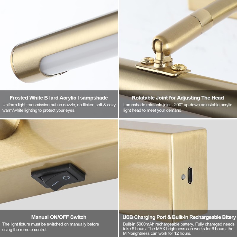 Kiloeye Picture Lights Battery Operated with Remote, Rechargeable Picture Lights for Wall Brightness Dimmable Sticker/Screw Installation, Art Light for Gallery, Artwork (Golden, 16‘’)