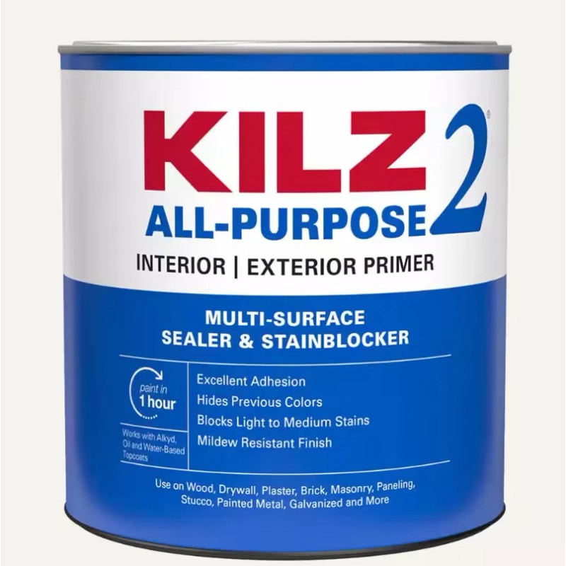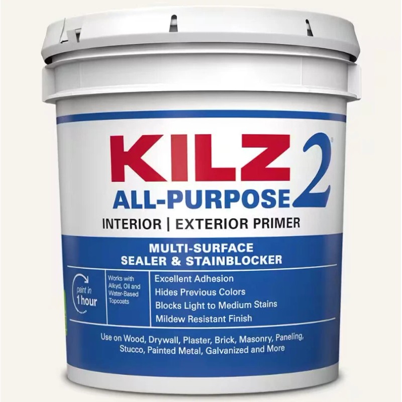 New Look, Same Trusted Formula, KILZ 2 ALL PURPOSE 5 Gal. (Previously KILZ 2 Latex) is a fast drying, water-base, multi-surface primer, sealer and stain blocker with excellent adhesion, sealing properties and very mild odor. KILZ 2 ALL PURPOSE primer also blocks light to medium stains and provides a mildew resistant coating. Use on interior and exterior surfaces including drywall, woodwork, plaster, stucco, paneling, masonry, brick, concrete, galvanized and painted metal.