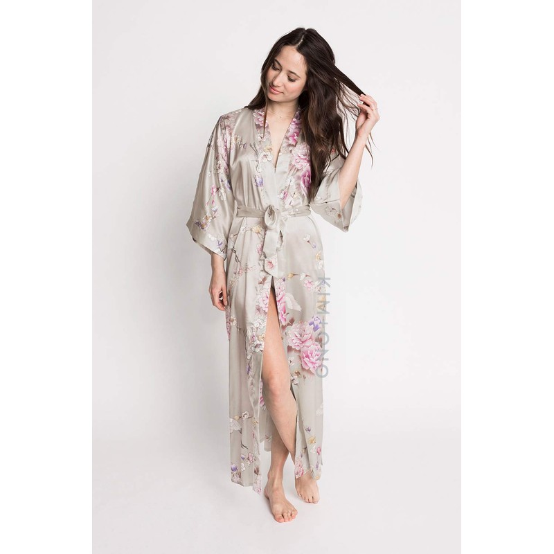 KIM+ONO Satin Kimono Robe Long - Chrysanthemum & Crane - Willow (Grey)