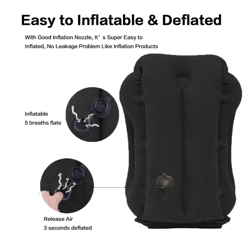 Inflatable Travel Neck Pillows -Anatomically & Ergonomically Designed Pillows For Cervical Spine Support To Help Alleviate NeckPain & HeadachesFor the neck, a Travel neck pillow usually works better to minimize torsion strain. sleep on the edge of the pillow where the head can be at a 45 to 60 degree angle. This helps to minimize cervical spine strain.Chances are if you have bad neck posture resulting from Inflatable pillows without correct support, this can result in bothersome snoring, headaches, lack of restorative sleep, tingling and/or numbness of your hands and arms in addition to neck pain and stiff muscles.So, having some of these problems can indicate that a good, supportive pillow can help,which offer support for the normal neck curve can minimize neck pain as well as headaches, providing a greater quality of sleep.Proper sleep helps eliminate fatigue, restore strength and energy, and ensure well body function.Benefits Of Travel PillowsKeeping your head and neck supported while traveling, improving comfort and safety and getting a good nights sleep. Travel pillows can help to make your traveling experience less stressful and less painful.FAQ:1.Why it has some smells?- After a long time of airtight packaging, when the packaging is just opened, there will be some smell. Generally, the product will be put in a ventilated place, and the smell will disappear after 3-5 minutes.2.How to use the product?The product can last for 2 days when it is full. When it is not in use, customers are advised not to store it in the inflated state, which will reduce the service life of the product.2.What is the size?- Color: black Un-inflated size: 5.8*4.7*2.3 inches Inflated size: 19.6*11.8*11.8 inches. Applicable occasions: office, plane, travel.