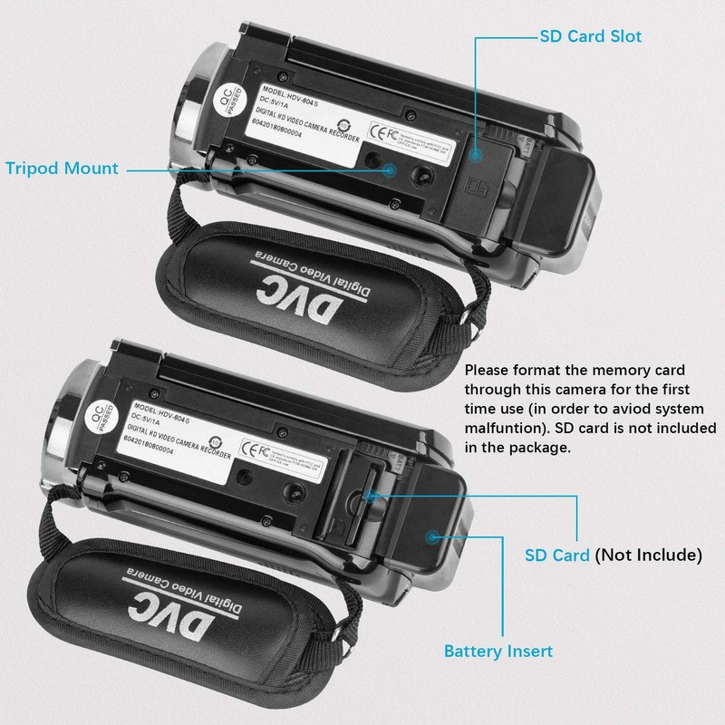 - Small and Compact Camcorder: The camcorder supports SD card and SDHC card up to 128GB not included, just remember to format the SD card before use the camcorder first time. The camcorder support the tripod not included connection and the hole is standard size