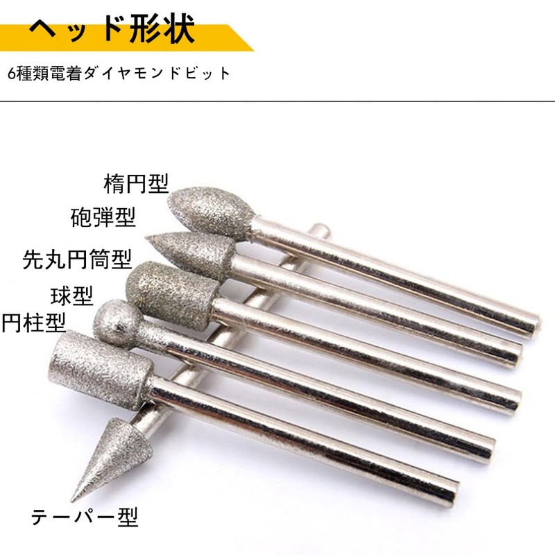 - Head Shape: Sphere, Round Tip, Oval Shape, Cylinder, Taper, Bullet Type; 6 Types of Electrodeposited Diamond Bits It can be used in a variety of ways depending on the shape and purpose, making it suitable for a variety of occasions