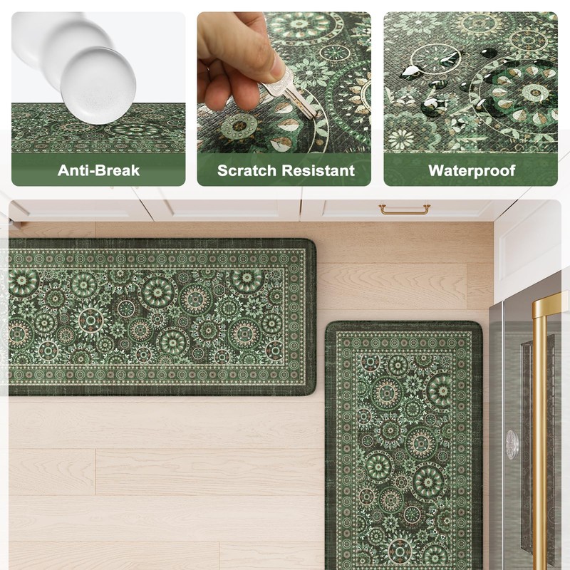 KIMODE Anti Fatigue Kitchen Mats for Floor 2 Piece Cushioned Boho Kitchen Rugs Memory Foam Kitchen Floor Mats Standing Desk Mats for Laundry Office Sink Green 17"x47"+17"x29"