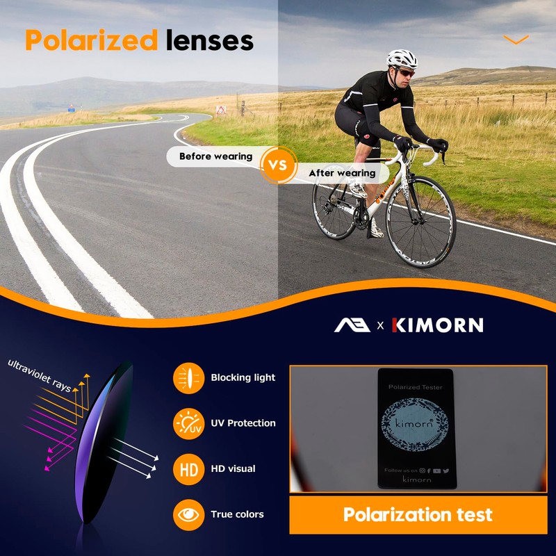 • KIMORN Vision lenses can block both UVA and UVB radiation. UV400 rated sunglasses is essential to protecting your eyes against long term UV damage and keeping your eyes healthy when you go out.