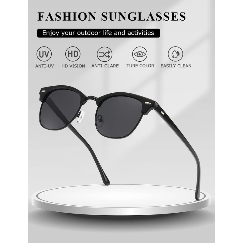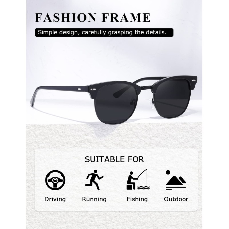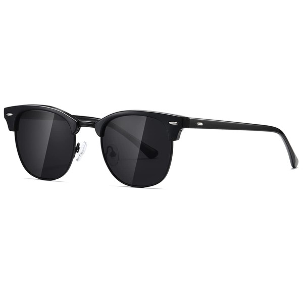 kimorn Polarized Sunglasses Unisex Retor Semi-Rimless Frame Classic Eyewear AE0550 (Black, 52)