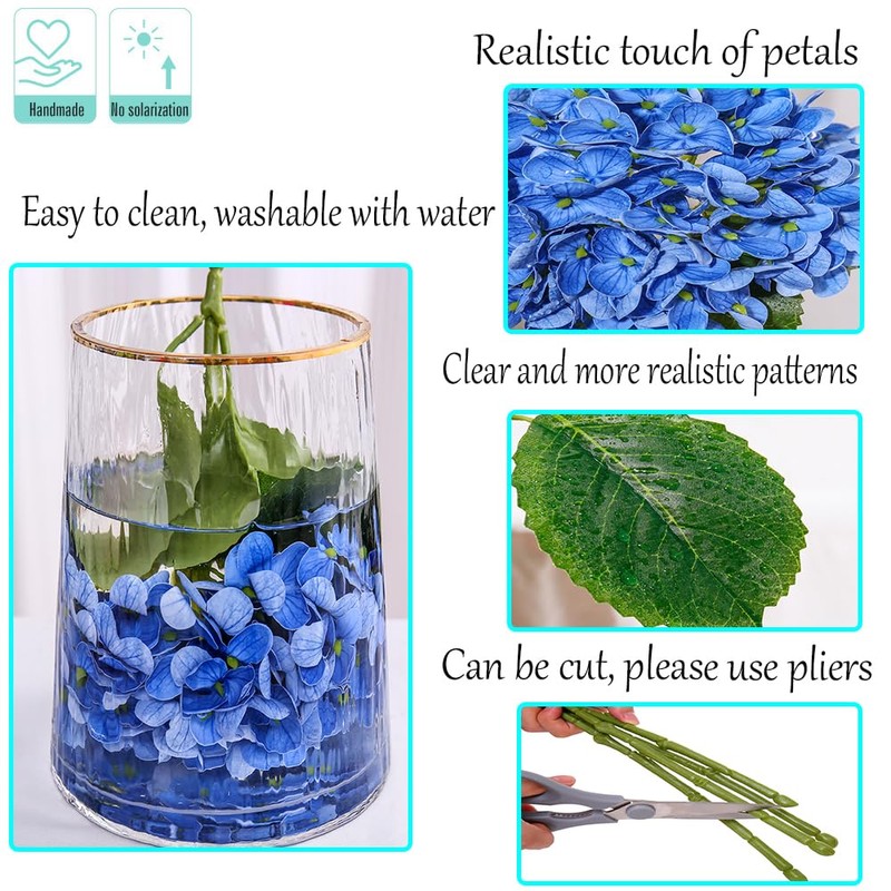- Appearance Material: The Artificial Hydrangeas look like real,Made with 3D print latex ,Feel the petals full and moist, Our petals have realistic textures and bright colors, and the stems are made with iron wire inside, which are more durable than other stems on the market,No smell,safe for people and pets.More real, and softer than ordinary hydrangea.After spraying water, the petals can condense water drops, can be placed outdoors, and resistant to fading.