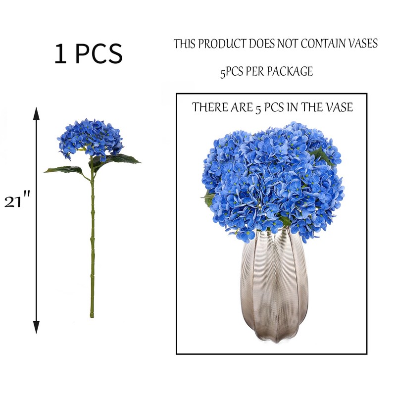 - Specification And Size: A set of 5 pcs real touch hydrangeas. Each stem stands at 21 inches(53CM), boasting a generous flower head diameter of 7 inches(18CM) accompanied by 3 leaves.Each flower has 132 petals,The flexible and individual stem allows you to bend easily or cut shorter for DIY or fitting variety kinds of vases in a realistic way the display is both lavish and realistic. Note: Vase NOT Included.